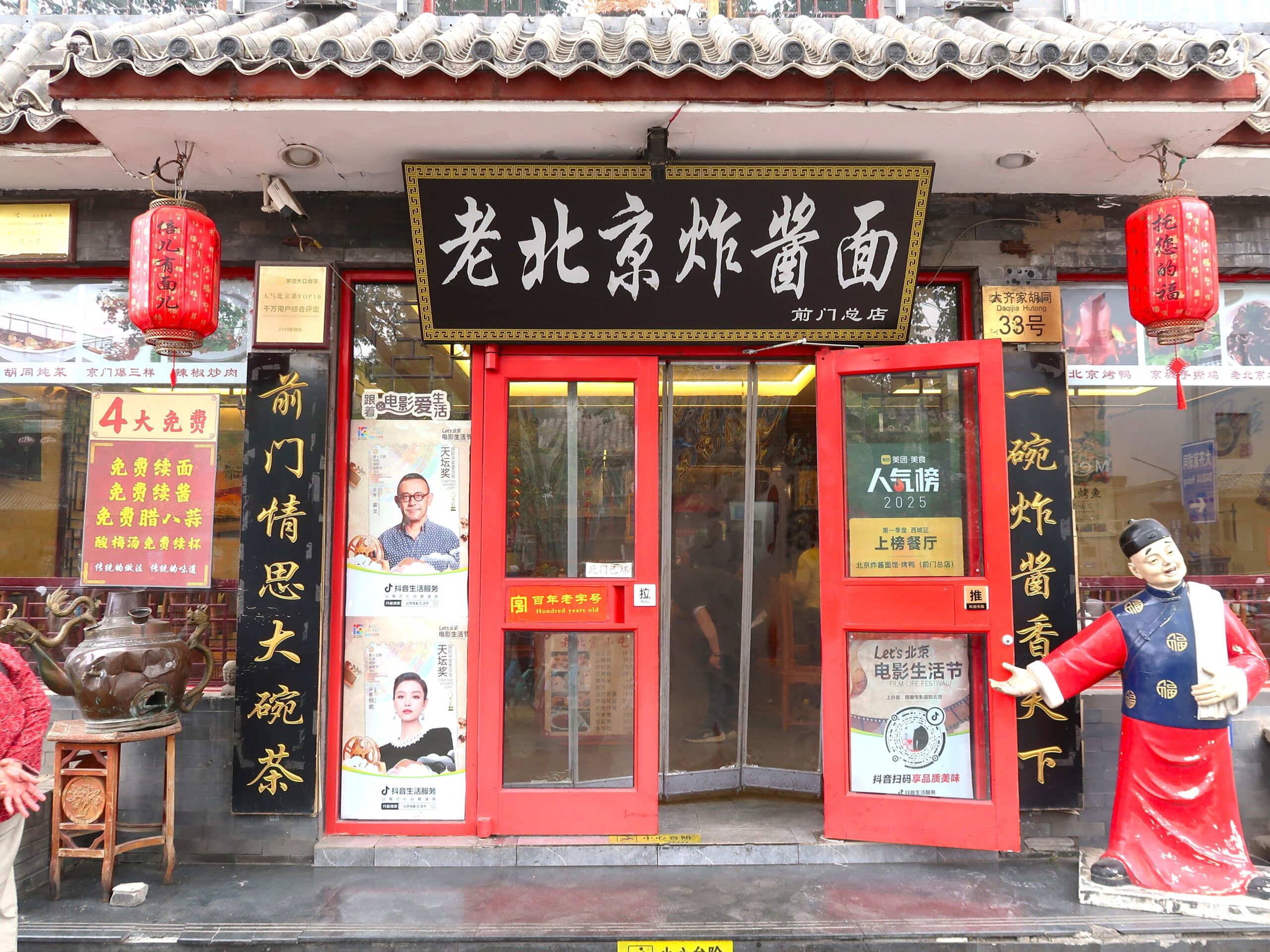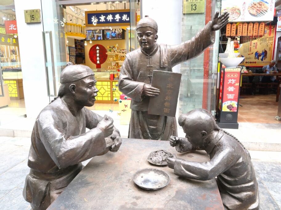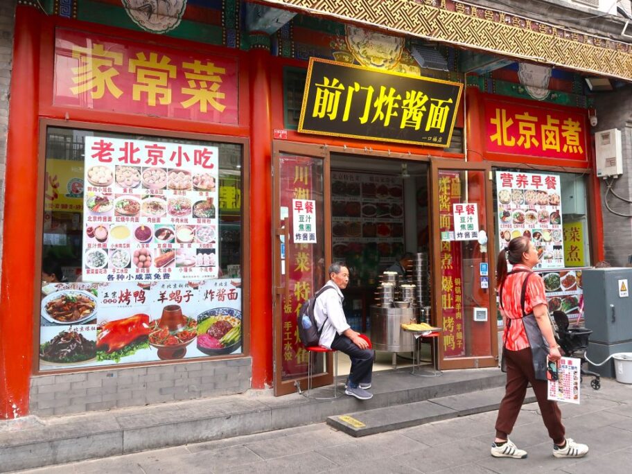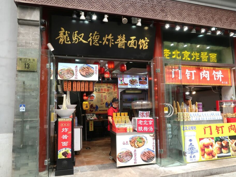 天安門広場にも近い北京の繁華街が前門。大柵欄と呼ばれる古くからの商店街はジャージャー麵の激戦地で、炸醤麺を強調した看板が並びます。