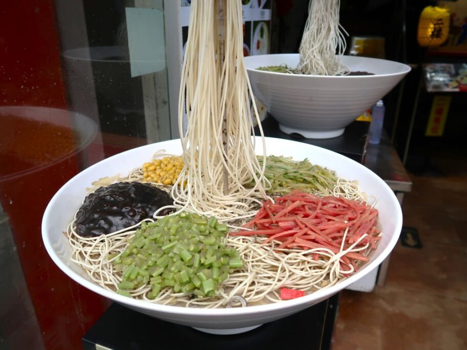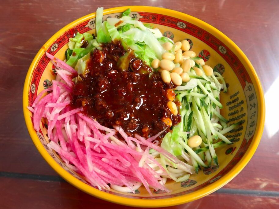 野菜ものせますがキュウリが定番。でも最近はジャージャー麵も高級化し野菜が多彩になっていました。2025年5月に北京で飛行機乗り換えの空き時間を利用してジャージャー麵を食べに行ってみたらビックリ!