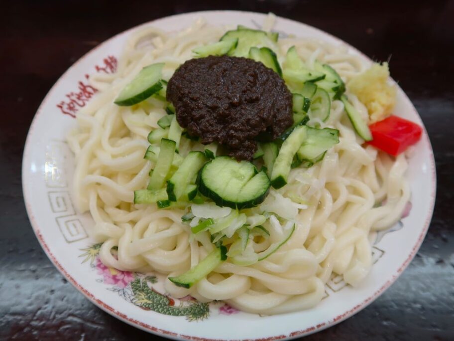 味噌だれは塩味が強く北京の炸醤麺に近い感じ。違うのは麺が平たいうどん系で、ショウガなどが添えられていることですね。