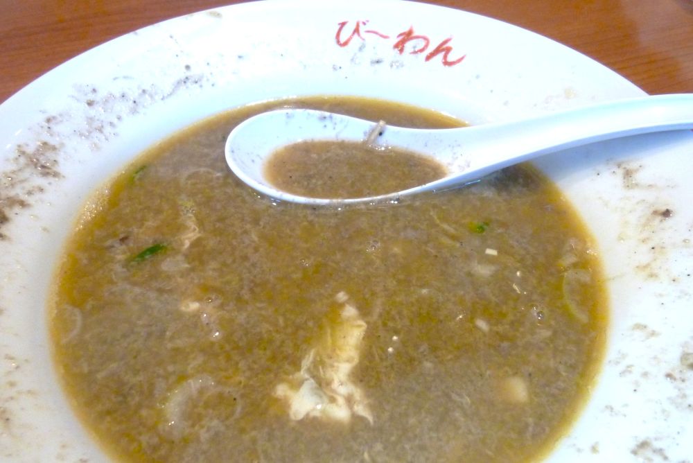 他のジャージャン麵に無いじゃじゃ麵の特徴が「ちいたんたん」。漢字で書くと鶏蛋湯ですが、その中国語読みです。卵は中国語だと蛋と書き、湯はスープを意味します(お湯は熱水と書きます)。
