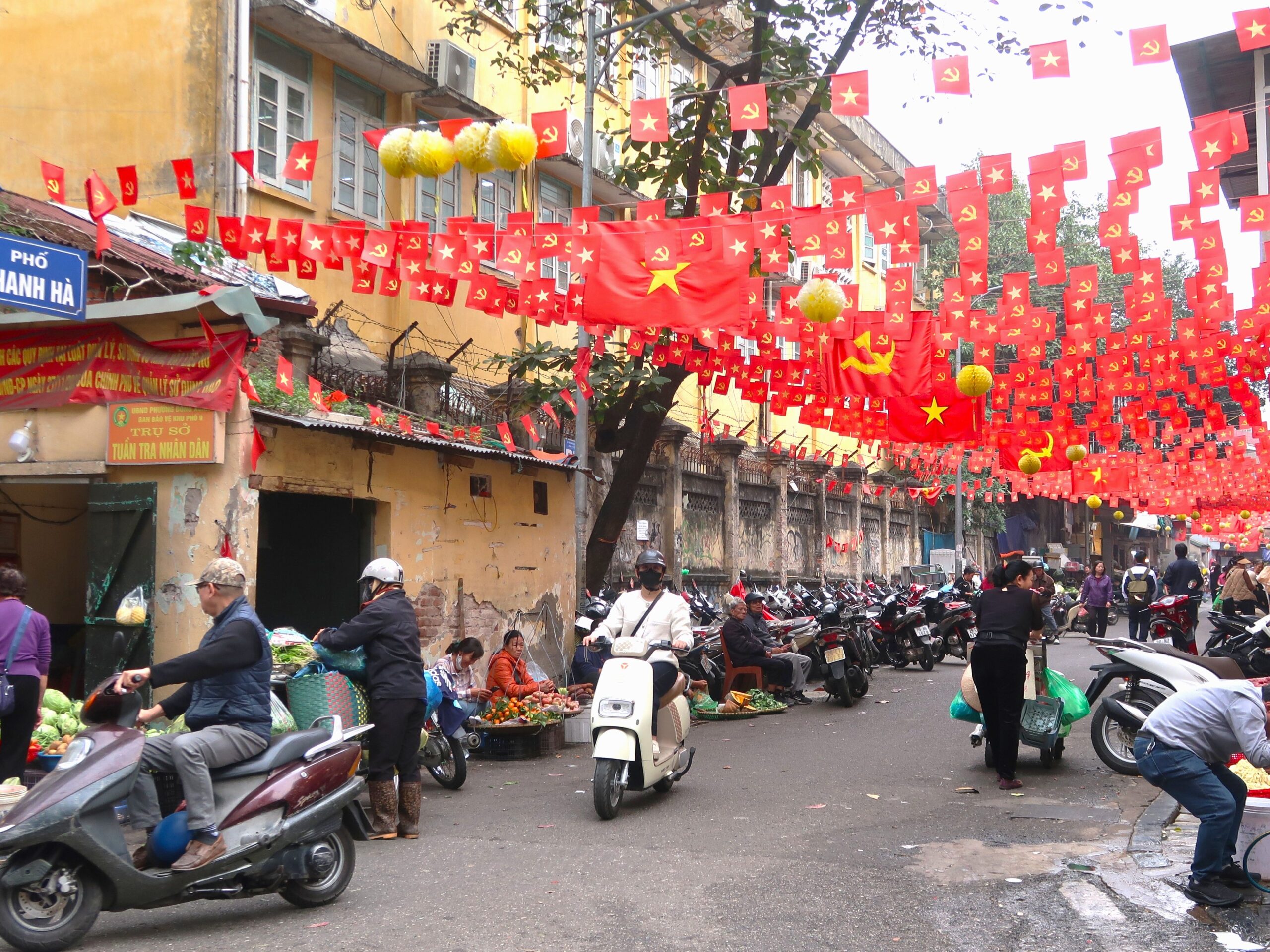 国旗に飾られるハノイ旧市街